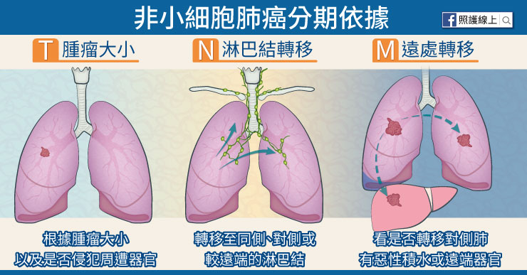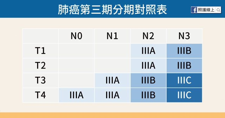 1. 淋巴結侵犯屬於N0或N1,代表淋巴結侵犯尚未超出原本腫瘤生長處的肺臟,但腫瘤狀況較嚴重,像是腫瘤較大,於同側肺臟有次發的腫瘤形成,或腫瘤已經侵犯胸壁、支氣管、或縱膈腔。