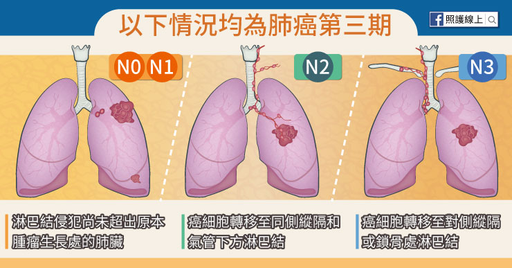 3. 淋巴結侵犯屬於N3。代表癌細胞已經侵犯縱膈腔靠腫瘤對惻肺臟的淋巴結,或已經是侵犯到鎖骨附近或頸部附近的淋巴結了。