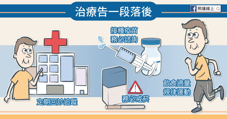 平時要養成健康的生活習慣,規律運動,飲食均衡,喝足量的水,萬一治療後食慾太差或體重過輕,可以找營養師調整飲食。患者要避免喝太多酒,還有很重要的一點是「務必戒菸」,戒菸真的很難,但為了肺臟和其他器官的健康,請務必戒菸。維持健康的生活習慣,也能提升治療的效果呢。