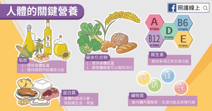 人體關鍵營養素包括碳水化合物、蛋白質、脂肪、礦物質、與維生素
