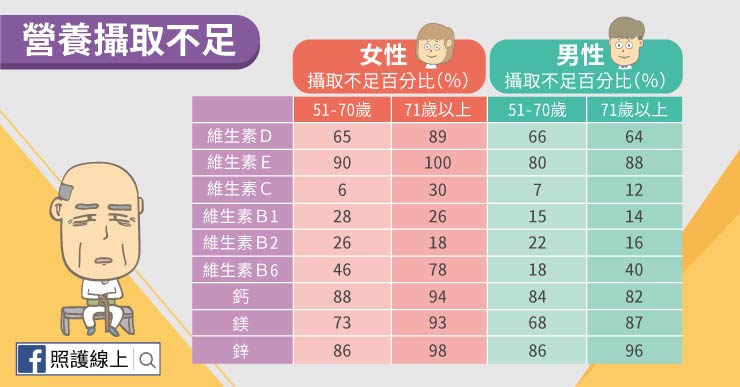 根據國民健康署的資料,營養失衡的狀況其實相當常見。六十五歲以上的民眾整體熱量的攝取上常常不足,至於各種重要營養素,像是維生素與礦物質,也是不太夠。從圖表上我們可以發現,超過七十歲的女性,有八成以上的人其維生素D、鈣、鎂、鋅攝取不足,維生素E更是普遍缺乏