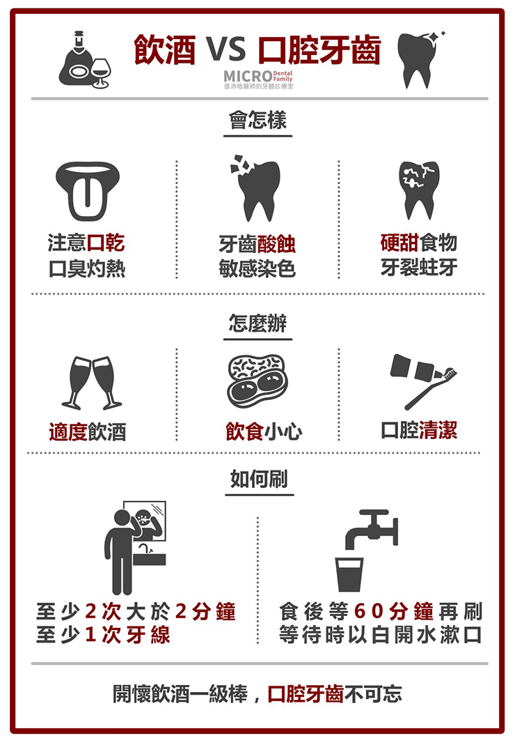適度飲酒很開心,讓人放鬆;有些喝醉酒的朋友,忘了自己有沒刷牙,讓牙齒長時間暴露在上面說的酸性、牙菌斑、高糖食物中,蛀牙就悄悄找上了。