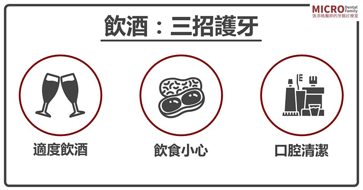 若真的必須喝酒,請不要忘了:『1. 適量飲酒。2. 飲食小心硬與韌的東西、記得多喝白開水。3. 口腔清潔不可馬虎。』