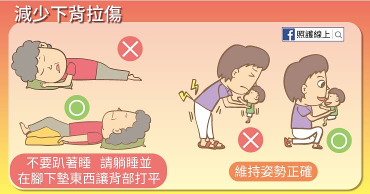 如果平常容易下背痛或是很常拉傷,請躺著睡,多拿一床棉被折一折,墊在膝蓋與腳下,這樣下背能夠最貼平床墊,最有支撐。醒來後自己想想看是否有下背不適的問題,如果下背還是不舒服,要看看床墊是不是太軟了,支撐力不夠。
