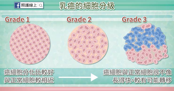 組織切片報告裡,我們還會細胞的分級,這個細胞分級與癌症分期不一樣喔!病理報告裡面的細胞分級是去檢驗癌細胞與正常細胞的相似程度。分級低(grade 1)代表癌細胞長得與正常細胞比較相近,分化比較好,所以會長得較慢、比較不會轉移。分級高(grade 3)代表癌細胞與正常細胞非常不像,這樣的癌細胞長得快,較有可能轉移