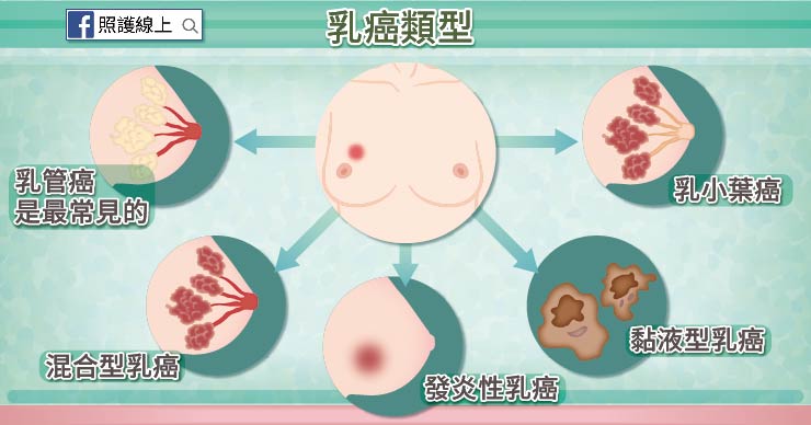 我們把乳房組織長出的癌細胞稱為乳癌,但實際上在顯微鏡下,乳癌還可以分成不同類型。絕多數患者罹患的是「乳管原位癌(Ductal Carcinoma in Situ,簡寫為DCIS)」和「侵襲性乳管癌(Invasive Ductal Carcinoma,簡寫為IDC)」,也就是說乳癌細胞多是從乳管長出來的。侵襲性乳小葉癌、葉狀瘤、發炎性乳癌等比較少見。