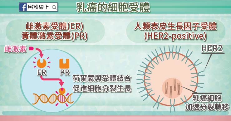 ER和PR都是荷爾蒙的受體,如果細胞有這兩個受體,代表女性荷爾蒙會與受體結合,進而影響細胞的基因表現,促進細胞分裂生長,抑制細胞凋亡。還沒有停經的患者比較可能罹患不含荷爾蒙受體,也就是ER、PR都屬陰性的乳癌。