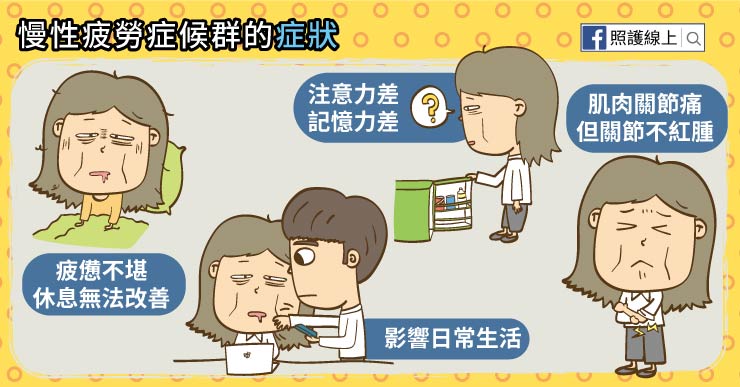 主要症狀是連續六個月來,患者都覺得疲憊不堪,即使臥床休息仍不覺改善,嚴重影響日常生活的活動力。