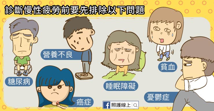 看到這裡你可能會想:「好吧!也有這樣的疾病呢!一直很累的一個病啊!」其實要下這個診斷並不容易。這樣的患者常是因為疲憊不堪而接受了很多檢查,想想看,血糖高也會讓人覺得累,飲食狀況失調也會讓人覺得累,所以當主訴是「覺得累」時,醫師會先看看患者是否有感染、糖尿病、心情差、癌症、營養不良等問題,因為這些原因也都可能會讓你很疲倦。要先排除這些可以治療、或可能致命的原因,才能說患者這是慢性疲勞症候群。