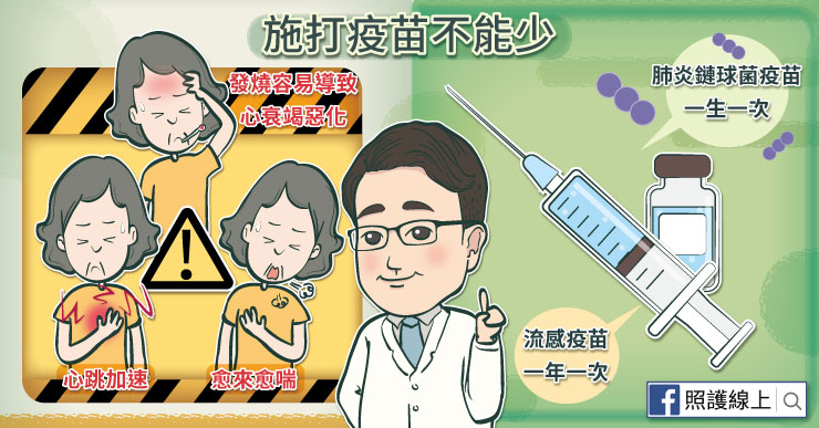 施打疫苗可以預防感染,因為我們最怕心臟衰竭患者發燒。發燒會讓患者變喘,並且心跳加速,破壞原本的平衡,使病情惡化。