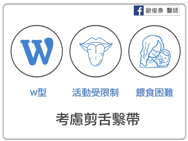 若又是當舌頭往口外吐出,舌尖不能超過下唇、影響舌頭活動,呈現W形,才需要考慮剪舌繫帶。而「舌繫帶過短」大部分是屬於「薄卻短的舌繫帶」,由於繫帶本身也會隨年齡增加而增長,所以除了以上狀況、不然不必急著剪。