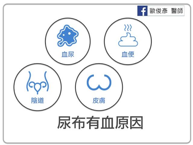 新生兒的尿布會出現血液,主要可以由血尿、血便、來自陰道、來自皮膚造成。發現尿布有血,通常先觀察寶寶的溫度、是否發燒?若是寶寶發燒了,就要考慮伴隨血便的細菌性胃炎感染,或是泌尿道感染。