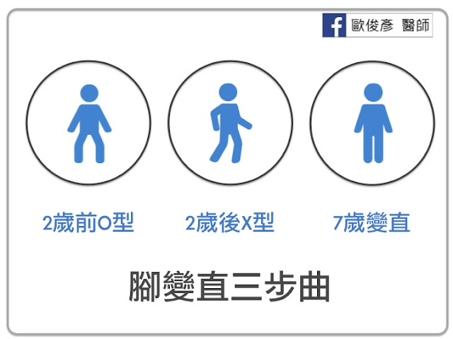 由於寶寶在母胎內姿勢關係,出生後大腿與小腿大約呈現10~15度的內彎、呈現O型腿,容易造成下肢腳的內八字,到了2歲後,下肢就會變得比較筆直了。而O型腿會繼續修正,會發現小孩的下肢伸直併攏、兩邊的膝蓋相碰時,雙踝卻不能併攏,反而變成X型腿、造成外八字腳了。