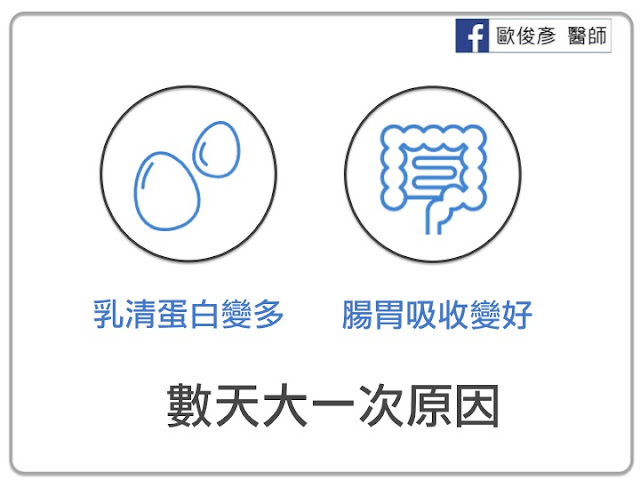 隨著乳清蛋白增加,吸收力變好,寶寶吸收能力變好,加上隨著寶寶成長,腸胃道也會漸漸成熟,對於吸收母奶能力增強,母奶被吸收和寶寶腸胃道吸收食物能力雙雙加強的狀況下,寶寶就可能會變成好幾天才會排便了。