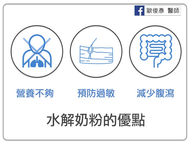 水解就好像把一千元鈔票,部分水解就是把它分成50元,完全水解就是把它分成10元。」鈔票分成較銅板之後,價值並不會會流失。水解蛋白奶粉是將蛋白大切小,並並不是抽離部分的氨基酸,所以這個蛋白質營養不會流失的,並沒有水解蛋白奶粉營養不夠問題。另外,很多的臨床看起來對於過敏性皮膚炎確實有預防的效果,但對過敏支氣管炎,目前還沒有一定的結論。