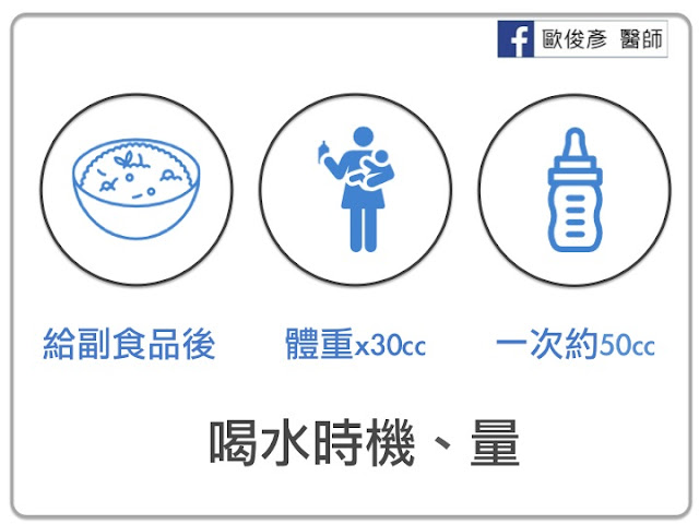 4~6個月後嬰幼兒開始接觸副食品,母奶和配方奶量的相對逐漸變少,此時嬰幼兒每天的奶量約每公斤乘以100~120c.c.,水分相對減少,就可一次約一次50c.c.少量飲水。但是一天喝水總量絕對不可以超過30c.c. x 體重。例如8公斤的嬰幼兒,一天的水量不可超過30c.c. x 8 = 240c.c.。