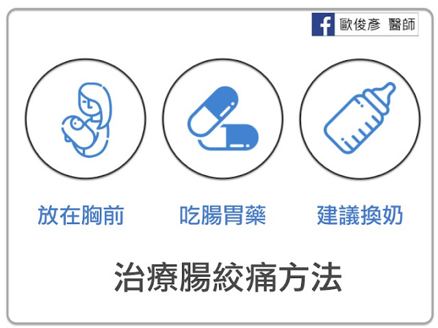 當寶寶發生「腸絞痛」時,最快的方法就是安撫寶寶,把寶寶放在母親胸前,讓寶寶聽聽媽媽的心跳聲,或是輕輕地順時鐘方向腹部按摩、毛巾熱敷腹部。若是持續超過兩天晚上寶寶還是不停的哭鬧超過3個小時以上,就會建議父母先帶著寶寶來門診求。