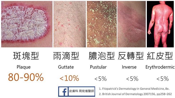 乾癬在形態上大致上可以分為五大類,其中以斑塊型與雨滴型最為常見,雨滴型常常在感染後發生,而膿泡型在臨床上須與其他感染和膿泡型藥物疹做鑑別診斷,反轉型的病灶位於皺褶處,脫屑通常比較不明顯。