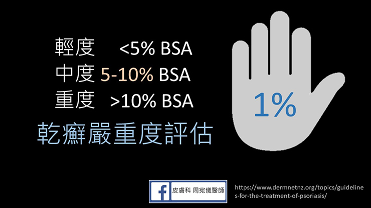 治療的方式取決於乾癬的嚴重度,臨床上最快速評估嚴重度的方法,就是使用手掌的面積去做量測,一個手掌大小算一個體表面積(1% Body Surface Area),以體表面積5%與10%來劃分輕、中、重度,但這種方法只能概估範圍上的嚴重度,對於病灶的紅、厚與脫屑狀況無法評估。