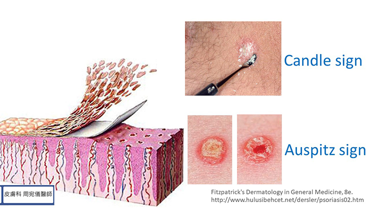 乾癬由於病理切片下,乾癬因為角質層角化不全,當我們用棉棒的木頭端去刮病灶時,會很像在刮蠟燭一樣,不斷有銀白色的皮屑掉出(Candle sign);另外因為乳突狀真皮層的微血管擴張,且其上方的表皮層相當薄,所以在繼續往下刮就會看到點狀出血(Auspitz sign)。這也是為何只要有懷疑乾癬的患者到了我的診間,我都會拿根棉棒來刮一刮。