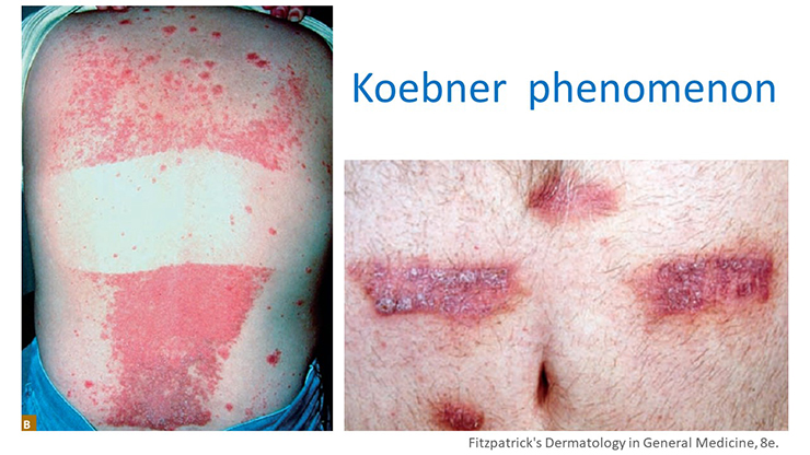 乾癬另外一個特別的地方,就是皮膚受傷的地方會長乾癬,如下圖左邊是為曬傷的乾癬病人,沒有衣物遮蔽的地方都跑出新的病灶,右圖則是一位接受皮膚切片的患者,在切片的位置長出乾癬。