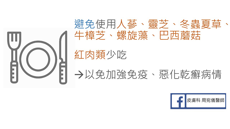 乾癬是免疫力過強,並不是免疫力低下,因此一些大補類的藥物或食材不適合吃,紅肉類可以吃但量不宜過多。之前曾經遇過不少吃完牛樟芝或人蔘的患者乾癬大爆發的狀況。