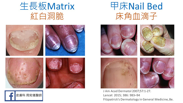 指甲表現如下圖,分為生長板病灶與甲床病灶兩大類,我編了兩個口訣方便記憶。