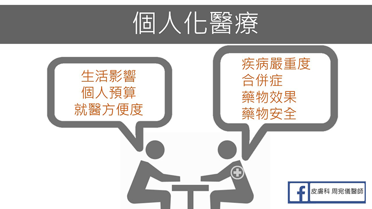 另外也會依據疾病嚴重度以及個人預算是否有其他合併症來選擇對患者較為安全且有效的治療方式,個人預算也是一個參考的依據,有不少高社經地位或是有保險給付的患者因為太忙無法就醫或對外表要求較高,會選擇自費施打生物製劑,也因此個人化的醫療在乾癬治療中顯得特別重要。