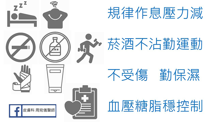規律的作息,心情放輕鬆,減低壓力,戒菸戒酒,努力運動減重,避免受傷都是基本功,另外認真擦保濕也可以預防乾癬的發生,如果有高血壓、高血糖或高血脂的患者也都要好好控制。