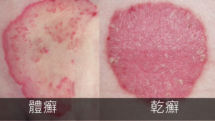 體癬是黴菌感染,一般為環形紅斑的分佈,外面一圈清晰可見,但中間相對比較乾淨,若誤擦到類固醇會越擴越大圈。乾癬則是呈現整個都是填滿的形狀,界線清楚,沒有中間相對乾淨的表現。