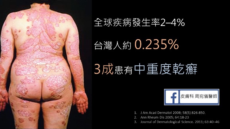 乾癬在全球的疾病發生率大約2–4%,台灣人大約 0.235%,其中有3成患者為中重度乾癬。