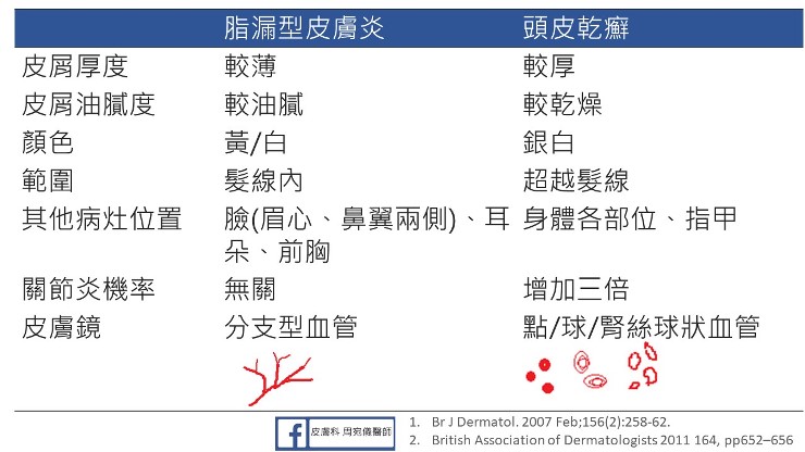 脂漏性皮膚炎與乾癬則是臨床上最難鑑別的,大致可以依照下表作區分,但若臨床上還是很難分,就會暫時歸在脂漏性乾癬(sebopsoriasis)的診斷,之後觀察是否有更多的線索再分類。