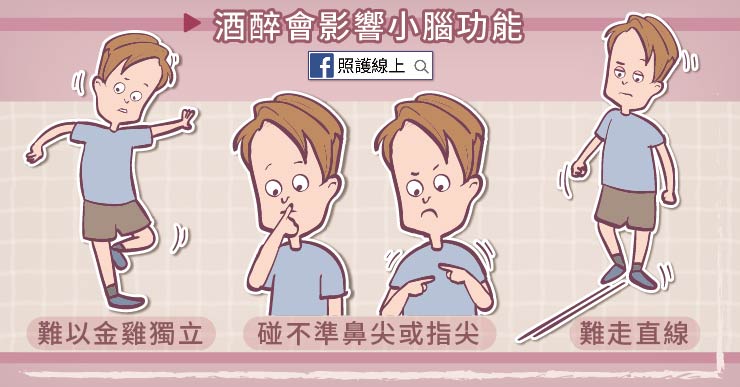 喝酒會影響到小腦的功能,因此在酒駕臨檢時,會請車主做個金雞獨立的動作,看身體是否能在單腳站立時維持一段時間,如果小腦受酒精影響而功能差,很難用單腳站好,人會顛顛倒倒的;還有個檢驗是指尖碰鼻子,請受試者手比”1”,檢驗者也是手比”1”,請受試者用食指指尖碰觸自己的鼻子,再去碰檢驗者的食指指尖。如果小腦功能不佳,手在移動的過程中會錯失鼻子或另一手指尖,無法精準碰到。第三個檢驗是大家最熟悉的走直線,如果請一位爛醉的人走直線,其小腦都已經被酒精影響到失去協調性、平衡、和姿勢了,是很難走個十公尺又迴轉走回原地的。
