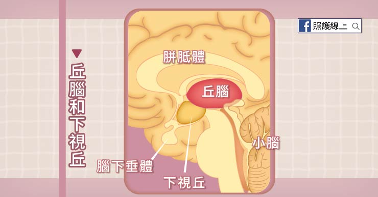 丘腦位在腦幹上方,可說是個訊息中繼站的概念,丘腦可以處理和傳送運動、感覺的資訊,幾乎所有從大腦皮質送出的訊息,或要送到大腦皮質的訊息,都會經過丘腦。甚至有人稱丘腦為腦部中樞(很重要的轉運站啊)。