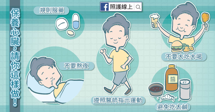 按時服藥,是對心臟最好的選擇。此外還要做到幾件事,包括遵照醫師指示運動、不要熬夜、不要大吃大喝、並記得避免吃太鹹。要記得定期量體重,體重增加通常代表身體積水,要隨時跟醫生回報體重上升的問題。