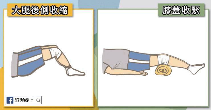 躺在墊子或床上,膝蓋下方墊一捲毛巾,接著出力打直膝蓋,大腿前側和小腿前方的肌肉都是繃緊地,腿部後側的肌肉則是伸長,停留五秒鐘再放鬆。反覆練習十次。再換腳練習。記得過程中其實腿部位置也沒有怎麼移動,只有腳底板往身體方向靠,讓腿前側肌肉收緊。