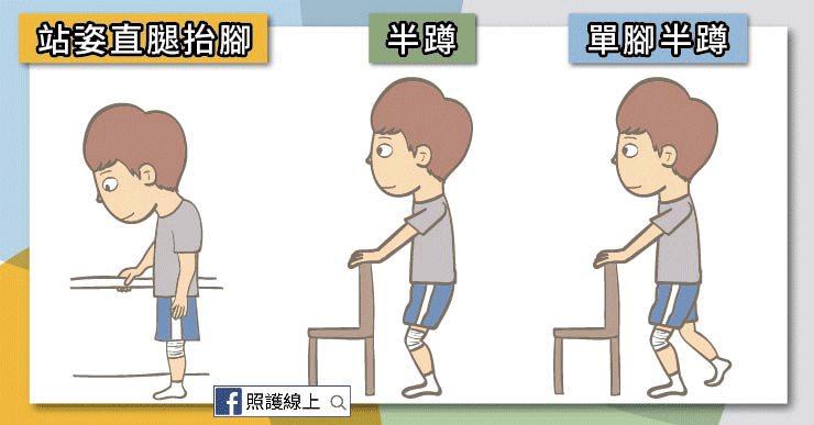 扶著穩定的椅子,或扶著病床,雙腳打開與肩同寬,背打直不要駝背,慢慢往下蹲,到了半蹲的程度後就停著,持續五秒鐘後再緩緩站起來,放鬆。反覆練習十次。