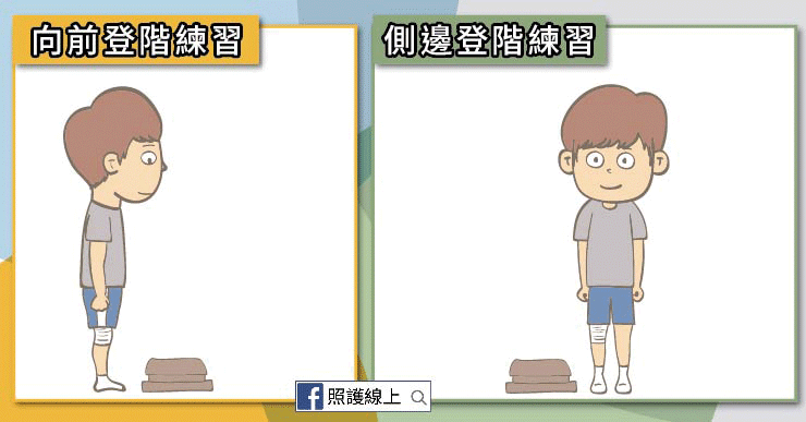 找個微有高度的平台或階梯,練習登階。請從低一點的階梯開始練,跟平面距離個十到十五公分即可。如果還在住院,看能不能到醫院的樓梯間練習。先站直面對階梯,踏上後再回到原始點。反覆練習10次後換腳練習。如果覺得不穩,可以先試著扶扶手。若已經覺得做的不錯,就可以找高一點的階梯,或是在家時你可以選擇爬上茶几、穿鞋椅等練習,但請注意安全。