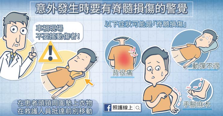 萬一不幸發生意外,如果是受傷時若有以下症狀,就要有「脊髓損傷」的警覺,千萬不要再亂動。