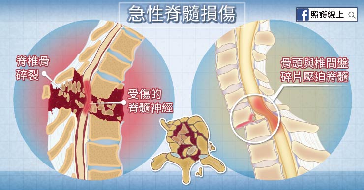 雖然脊髓受到我們一節節的脊椎「龍骨」保護,但在猛力撞擊下,被包覆在脊柱裡的脊髓神經可能因震盪而水腫、瘀青、受傷,脊椎骨頭、椎間盤都可能破裂,其碎片會刺傷脊髓神經。脊髓神經一旦受傷,後果通常很嚴重,想想看,主要傳遞訊息的高速公路被打斷,很多地方都會停擺!