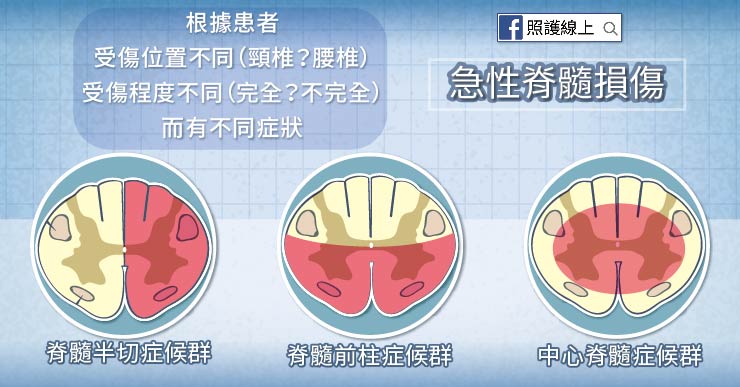 脊髓受傷的嚴重程度可以初步分成「完全損傷」和「不完全損傷」。完全損傷代表在這個位置以下的感覺及運動控制都失靈。不完全損傷可以分成很多不同型態,有的是左半邊或右半邊的脊髓受損,有的是前側兩邊都受損,有的是中心受損,當不是完全都受損時,患者可以有部分的感覺,或運動控制。