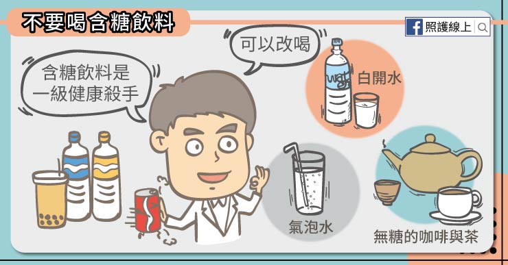 光是減少含糖飲料這一點,可能就會大幅減少我們的每日糖類攝取量,對體重控制也很有幫助喔!(大熱天喝糖飲,既不解渴又傷腎!)
