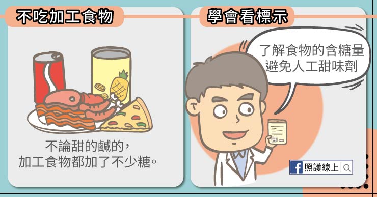 購買食物時,養成看標示的習慣。了解每一百克這個食物裡面,含了幾克的糖。目前建議每天女性不要攝取超過25克的糖,男性不要超過35克。(注意,這是高標,你不攝取糖類也沒關係喔!)