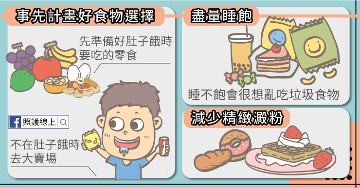 如果你突然覺得肚子很餓,就很容易亂吃東西,順手抓一把巧克力棒、餅乾什麼的,反正能止住肚子餓的就好。就算你是吃市面上標著「健康」取向的餅乾,像是雜糧棒、蛋白質補充包等,不一定真的健康喔!但如果你先想好,準備好一盒切好的芭樂帶到公司,就不用在點心時間吃零食。或者在家準備蒸熟無調味的花生、無調味的堅果、不加糖的果乾、水煮蛋、新鮮水果等,作為嘴饞時的點心選擇,就比較能揚棄各種甜滋滋但不健康的食物喔!