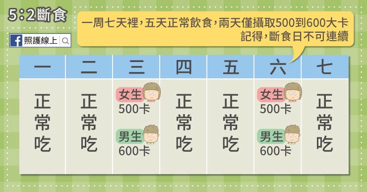 目前最有名的「間歇性斷食」叫做「5:2斷食」,代表一周七天裡面,有五天可以正常吃,兩天則是吃少少,還有,斷食的那兩天不可以是連續的兩天,中間至少間隔一天。