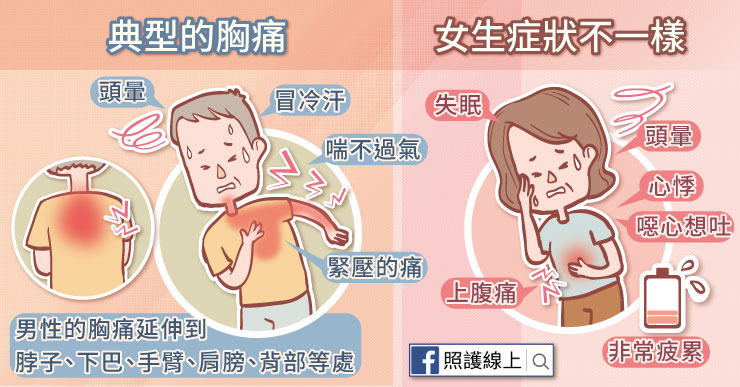 男性的心絞痛較常屬於「典型的胸痛」,至於女性的心絞痛發作時,可能有不太一樣的表現,很容易被忽略。