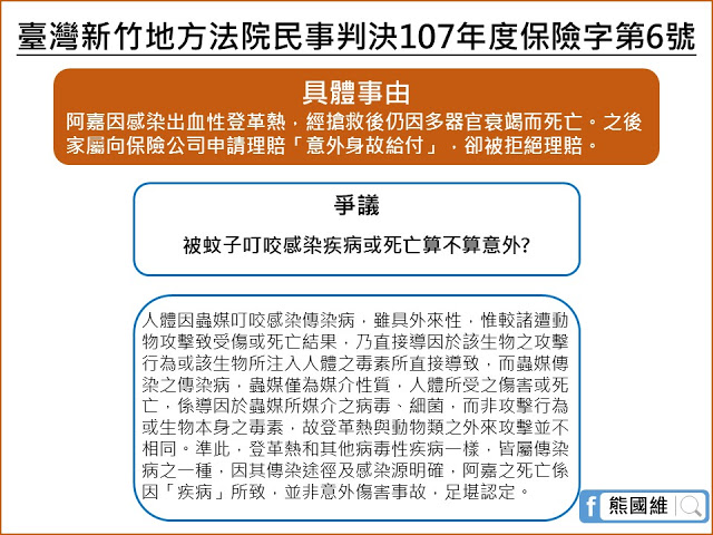 新聞報導,最近中南部「登革熱」疫情又開始拉警報。想起民國76年自己就曾經感染過登革熱,當時接近5000人確診,在高雄算是非常嚴重的災情。講起這段經驗後太太問我,被蚊子叮咬感染登革熱是算疾病?還是意外?意外險賠不賠。要回答這些問題,我們就一起來看看保險公司怎麼看?法官又怎麼看?