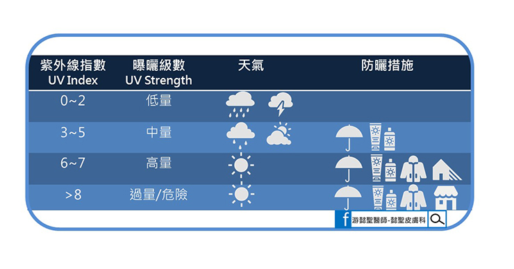紫外線指數落在3~5,曝曬級數是中量級,這時候就要防曬了,防曬不是只靠擦防曬乳,帽子、墨鏡、洋傘、衣物的遮蔽,可以直接擋掉部份的紫外線,方便又有效。