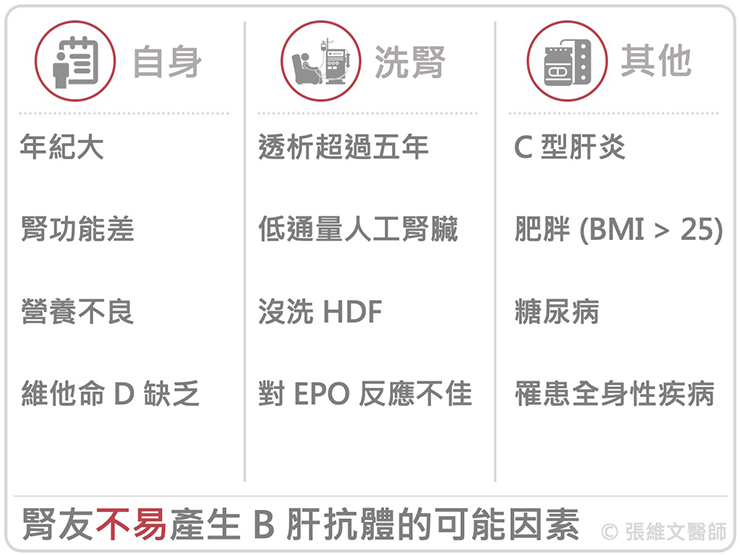 研究發現,下列情況是影響腎友未能產生足量 B 肝抗體的因素: