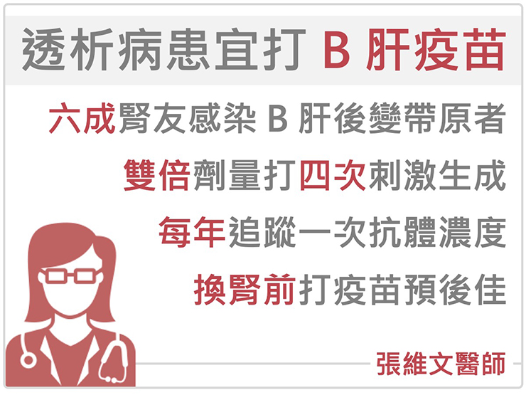 根據美國疾管局與 KDIGO 治療指引對慢性腎臟病患的建議,尚未洗腎的中重度腎功能不全者(腎絲球過濾率低於 30 ml/min)與已常規接受透析的腎友,若體內沒有 B 肝抗體,就應該要接受 B 肝疫苗施打,以增強保護力。